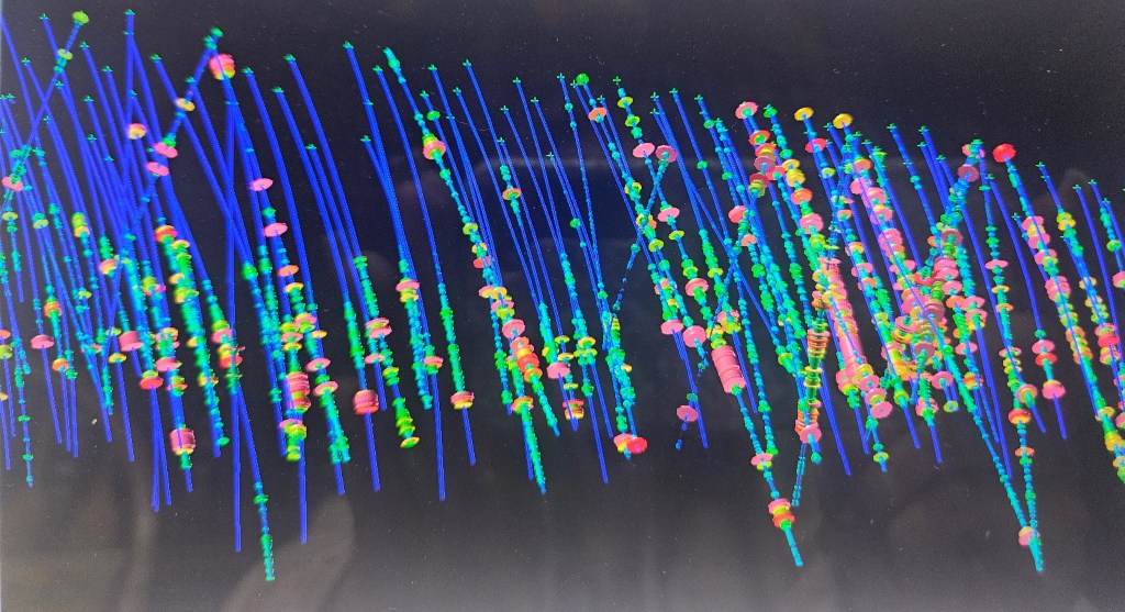 The pink, larger discs represent a higher lead grade, while the smaller blue ones represent a low one.